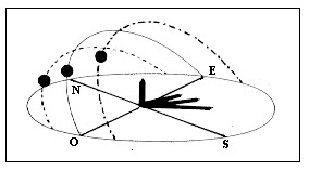 De este modo, podemos pensar al comienzo de las estaciones del año como fechas que indican por qué lugar del horizonte está saliendo y poniéndose el Sol. El 21 de diciembre, fecha de comienzo del verano, el Sol sale al sur del este y se pone al sur del oeste. El 21 de junio, fecha de comienzo del invierno, el Sol sale al norte del este y se pone al norte del oeste. En cambio, el 21 de marzo y el 21 de septiembre son los únicos dos días del año que el Sol sale justo por el este y se pone justo por el oeste. Miren la imagen de la derecha en la que están marcadas tres trayectorias del Sol y traten de determinar qué fecha del año le corresponde a cada una.