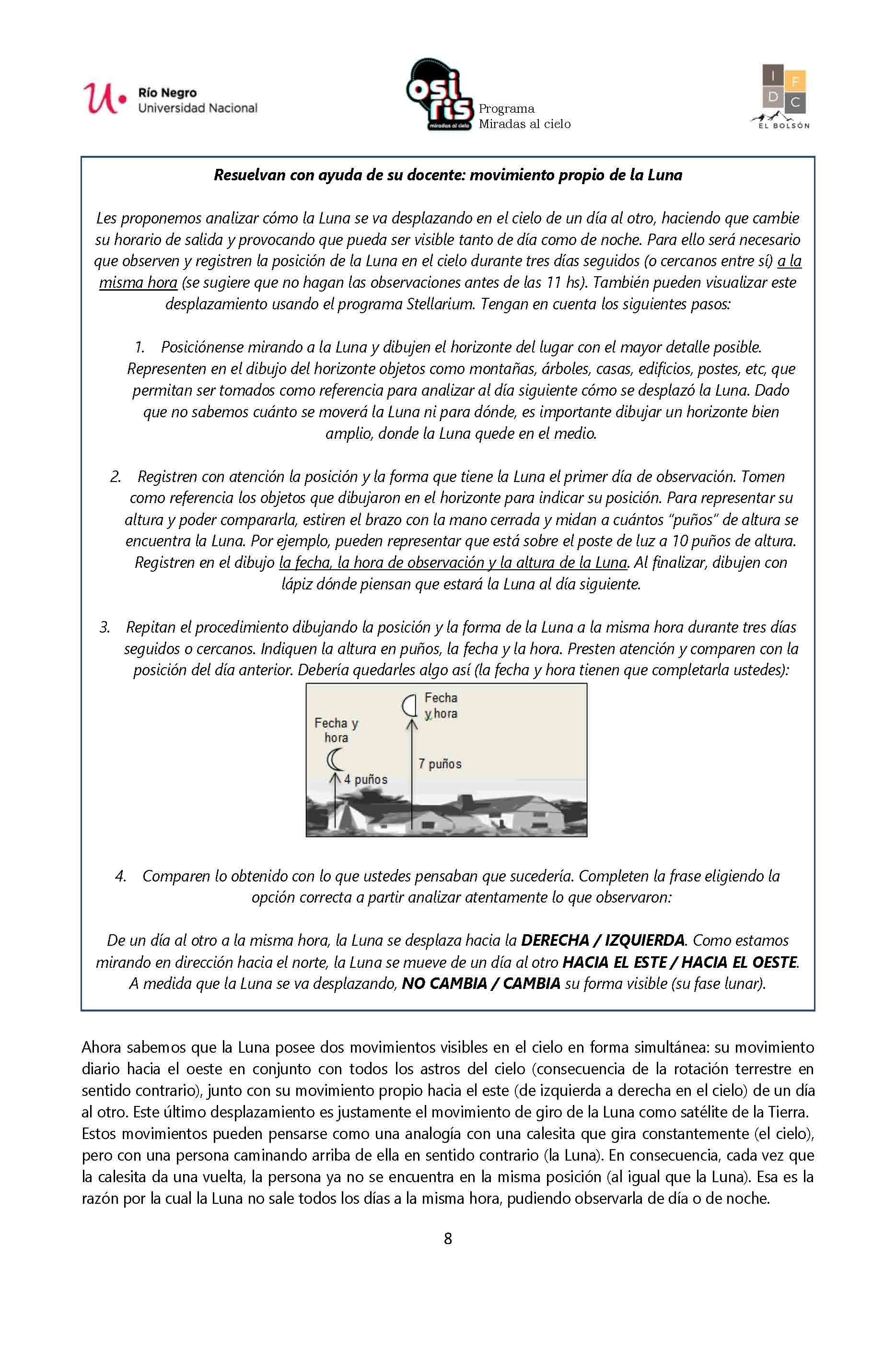 Hola! Acá los invitamos a compartir la actividad 5 que se realiza con el programa Stellarium, el cual les permite simular cómo se desplaza la Luna en el cielo hacia el este de un día al otro. Conviene observarla a la misma hora para que no nos influya su movimiento diario hacia el oeste. La consigna está en la página 8 de la propuesta didáctica. ¡Ojalá puedan observar este desplazamiento hacia la derecha también en el cielo! Aprendiendo este movimiento, ya sabemos por qué la Luna transitará por delante del Sol de izquierda a derecha durante el eclipse del 2 de octubre. ¡Esperamos que sea muy significativa la actividad!