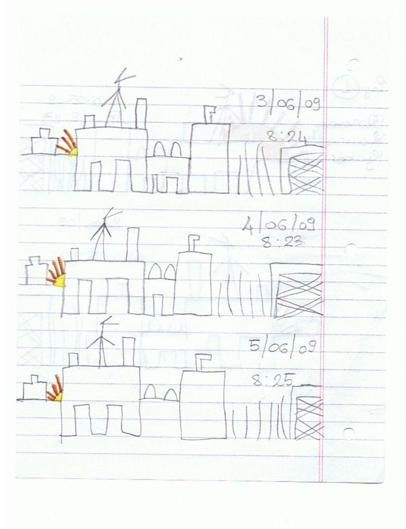 Hola Diego somos Florencia G. y Magalí, te contamos que los dibujos de cada una son siempre los mismos porque observamos cuando vemos que sale el sol desde el pasillo de nuestra escuela. No es fácil hacerlo pero intentamos.Vamos a tener en cuenta lo que nos pedís y te contamos. Saluditos
