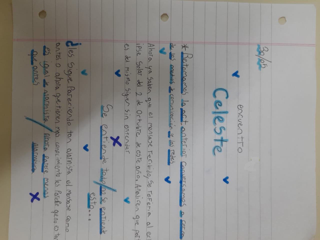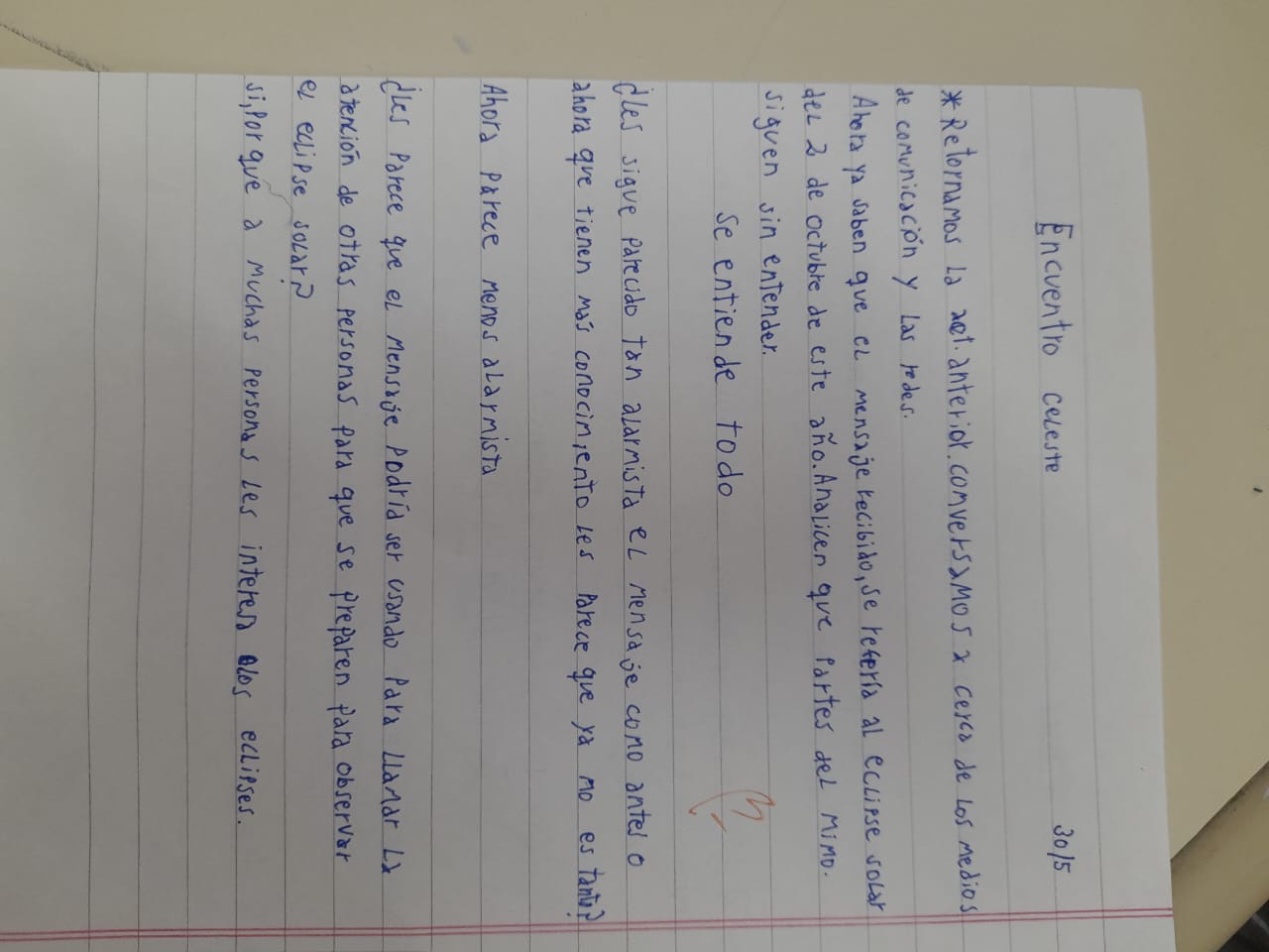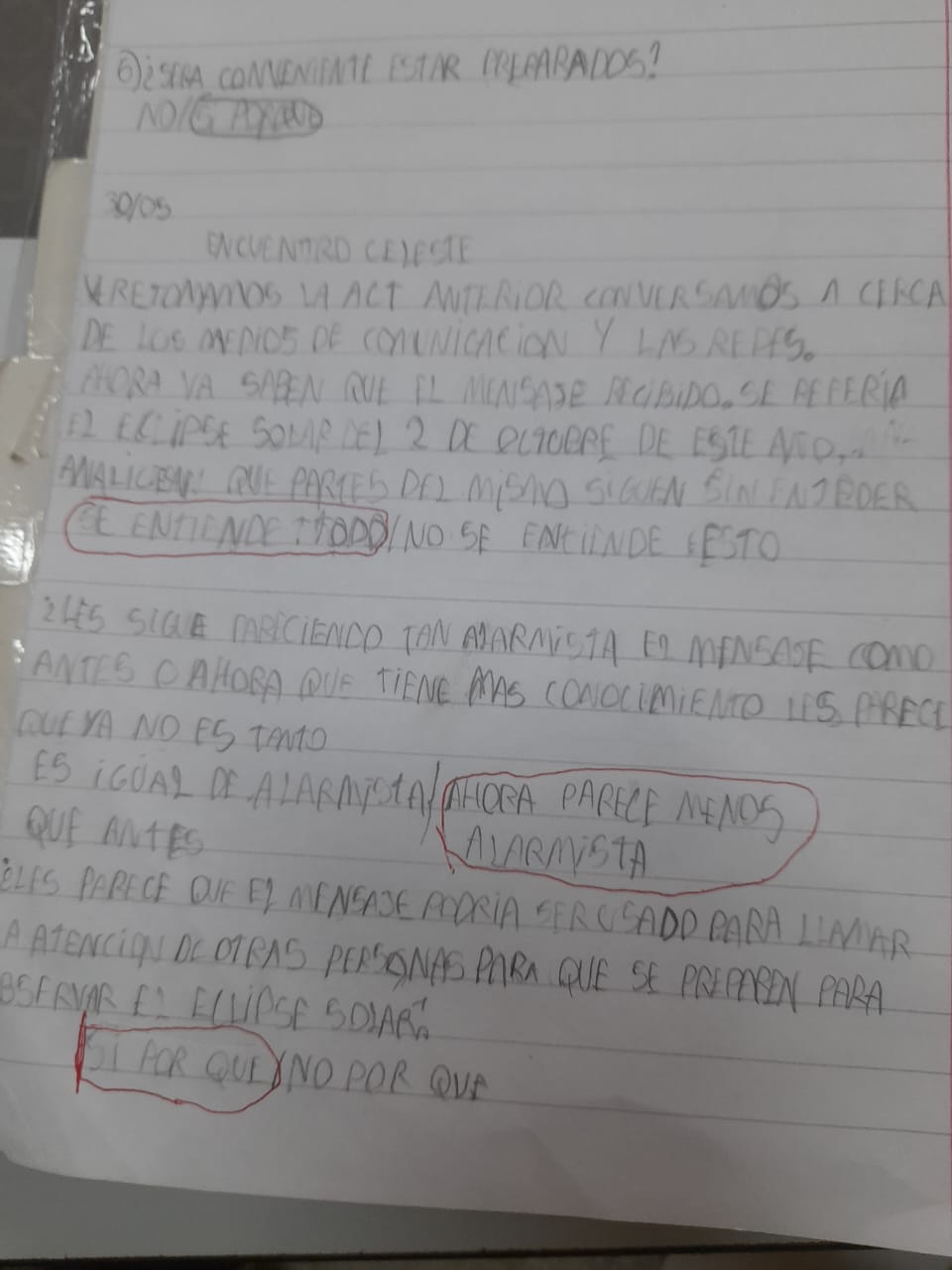 La siguiente actividad fue la del mensaje , para este momento le pase la imagen a las familias vía whatsapp para que se la muestren a los/las estudiantes , obviamente diciéndoles que esta información estaba circulando por las redes. Me dispuse a armarlo en formato cartulina para trabajarlo en el aula , y dejar esto pegado afuera para que otros/otras lean esto que va a pasar. Cuando los/las estudiantes volvieron a clases después del finde y vieron esta imagen en el pizarrón empezamos ha hablar sobre esto que va a pasar "El eclipse del 2 de octubre" y a completar las preguntas en grupo . de los "Mensajes que dicen a medias"