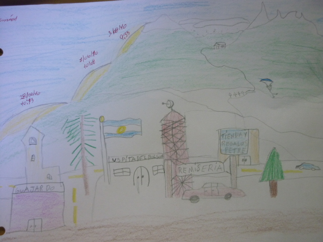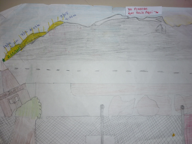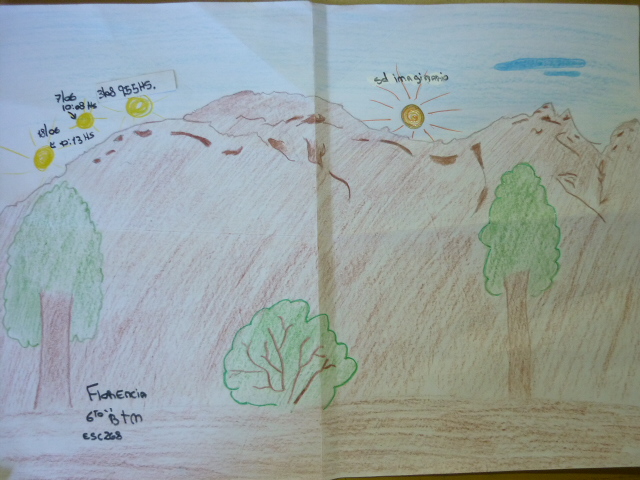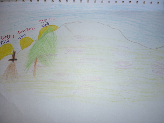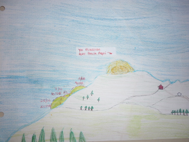 Ya que estamos, miremos los dibujos de los chicos de Buenos Aires, ¿a qué hora les estaba saliendo el Sol a ellos allá? Si miran el dibujo de Juan Manuel Rey, verán que ahí se nota que el 24 de junio vieron salir el Sol en Buenos Aires a las 8.42 hs. ¡Y acá recién 10.13 hs!! ¡¡Qué diferencia!! ¿A qué se deberá??...