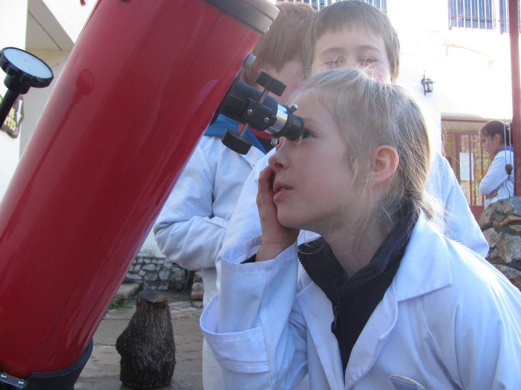 Durante el último mes estuvimos realizando observaciones semanales de la Luna... Forma, posición, horario, y compartiendo en clase... hasta surgió el tema que la luna se veía como un "fantasma" un atardecer del comienzo de cuarto creciente (cuando es solo un trazo en el cielo), lo trabajamos en clase con un globo terráqueo y una naranja que pedimos a las cocineras (jejejejeej), vimos como el reflejo del Sol sobre el globo terráqueo iluminaba la parte "nocturna" de la Luna y por eso tenia ese aspecto... con la Luna en cuarto creciente también aprovechamos para trabajar desde Matemática contenidos relacionados al uso del compás, el círculo y sus componentes (centro, diámetro, arco, semicírculo) al dibujar la Luna en clase... un truquito que usamos para recordar las formas fue el siguiente: cuando tiene forma de C esta creciendo (cuarto creciente), cuando tiene forma de D se esta yendo a dormir (recordemos que son chicos de 3ro y 4to, jejej)... terminamos haciendo una observación de la Luna en cuarto menguante por la mañana alrededor de las 10:00 con un telescopio de 4 1/2" en el que se prendió toda la institución y hasta algún padre que pasaba... jejejej