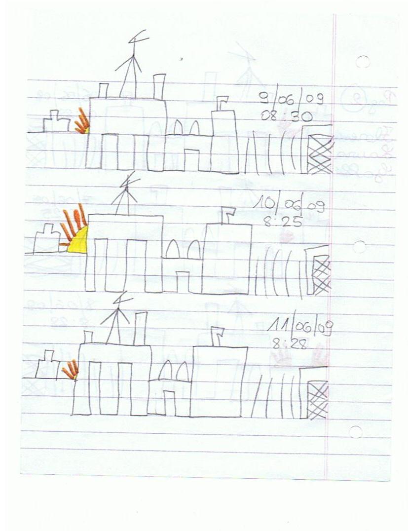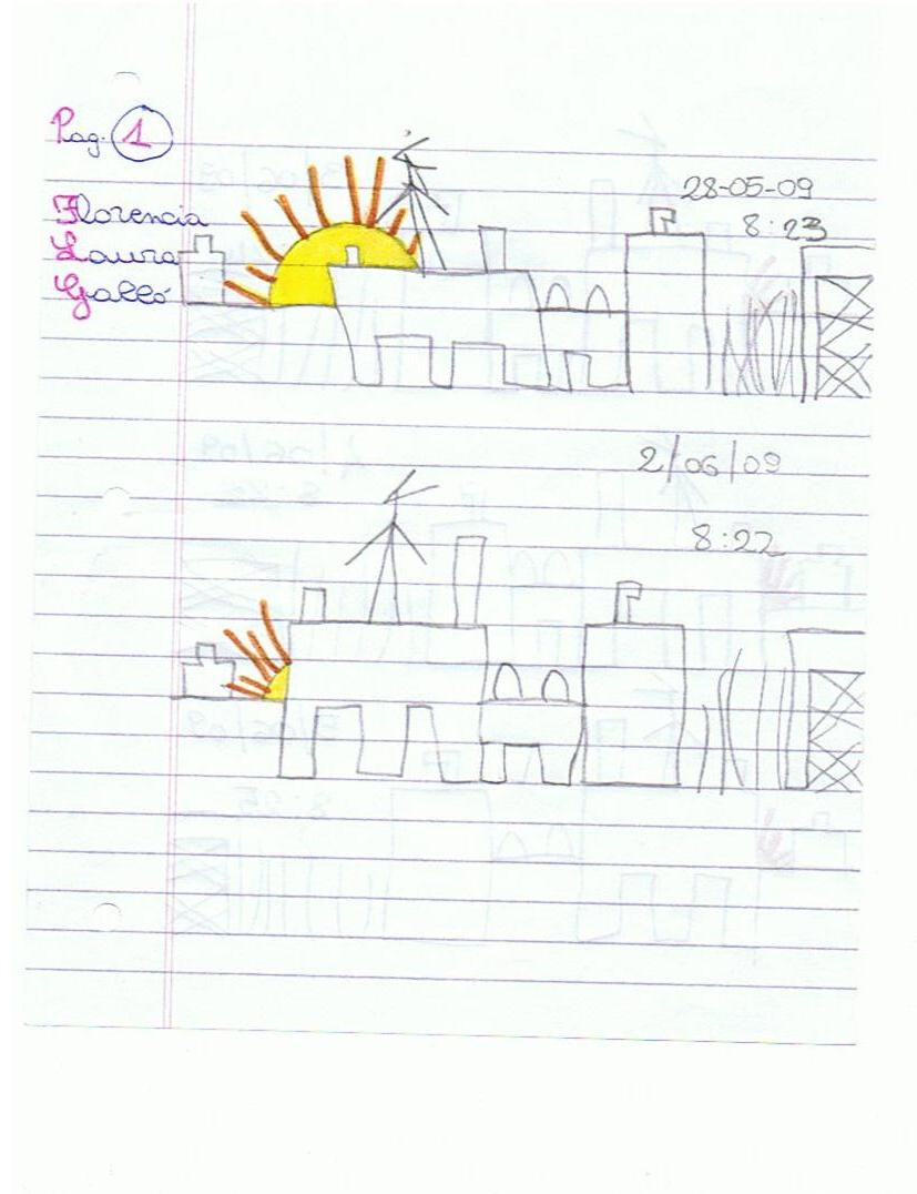 Hola Diego somos Florencia G. y Magalí, te contamos que los dibujos de cada una son siempre los mismos porque observamos cuando vemos que sale el sol desde el pasillo de nuestra escuela. No es fácil hacerlo pero intentamos.Vamos a tener en cuenta lo que nos pedís y te contamos. Saluditos