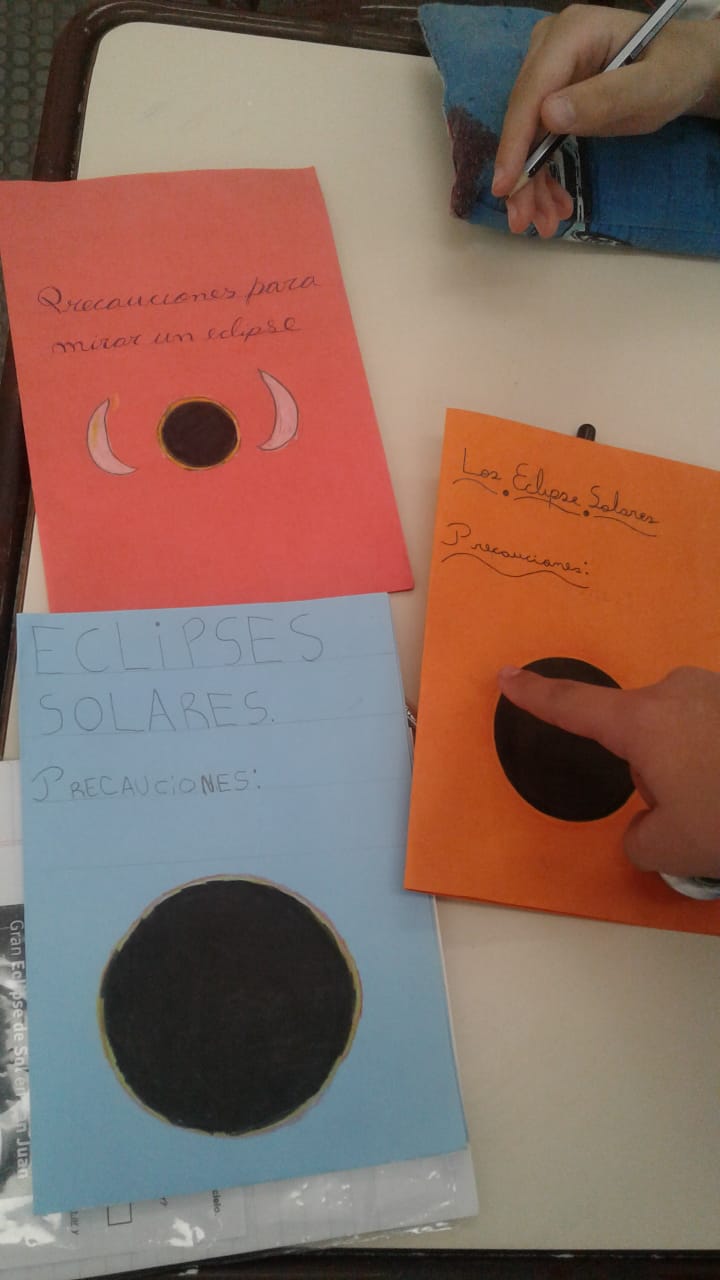 Los alumnos de 5to. grado turno tarde de la Escuela 4 D.E. 4 de La Boca estuvieron trabajando con el Desafío relativo al eclipse solar del 2/7/2019. Realizaron folletos para cuidar los ojos durante el eclipse solar. Fue muy entretenido y enriquecedor. Arrancamos viendo el video de la página www.miradasalcielo.com.ar donde dos alumnos de Osiris cuentan acerca del eclipse y sobre cómo observarlo de forma segura.