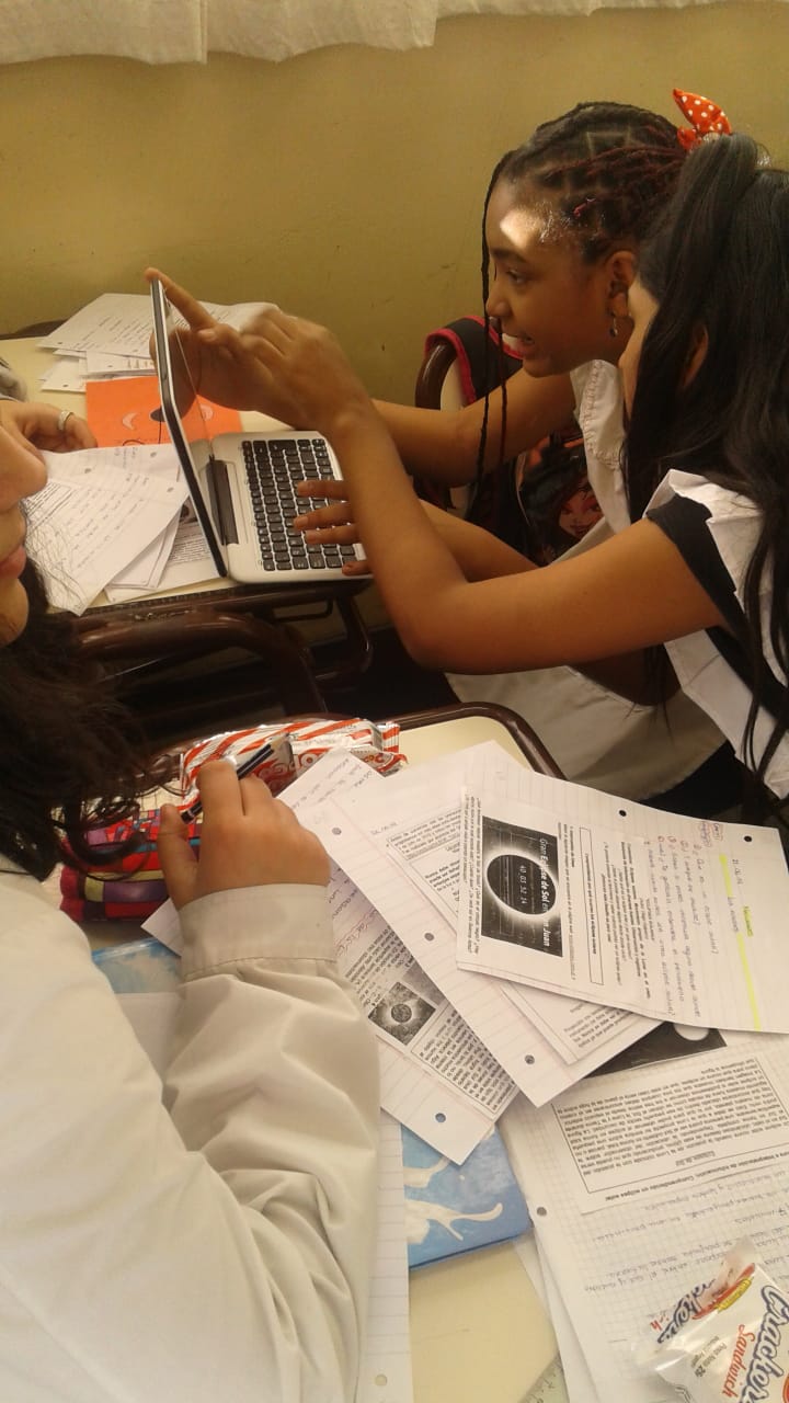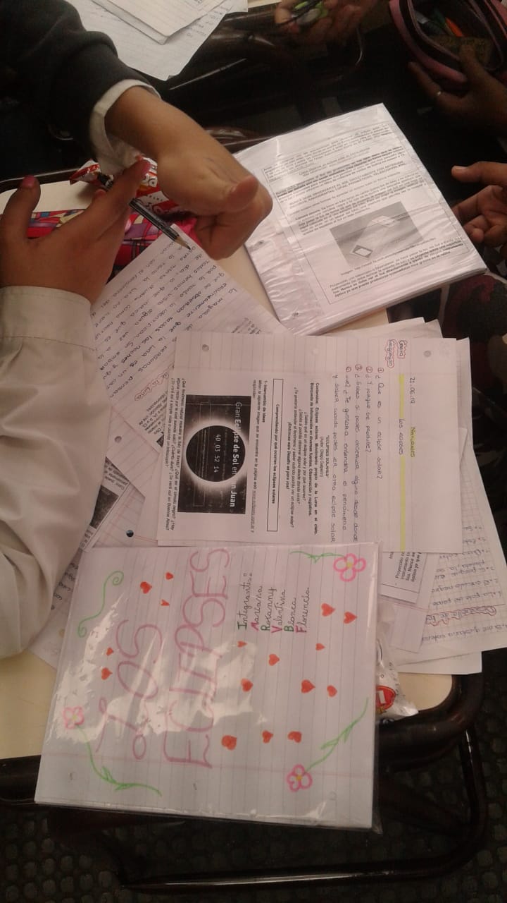 Aquí compartiremos los trabajos realizados por alumnos de escuelas de la Ciudad de Buenos Aires al realizar la propuesta didáctica "Desafíos" correspondiente a la observación del eclipse solar del 2 de julio de 2019. Pueden ser imágenes del cuaderno, fotos de los alumnos trabajando, registros de observaciones del cielo, folletos de difusión del eclipse solar y las medidas de precaución, etc. ¡Esperamos sus producciones!